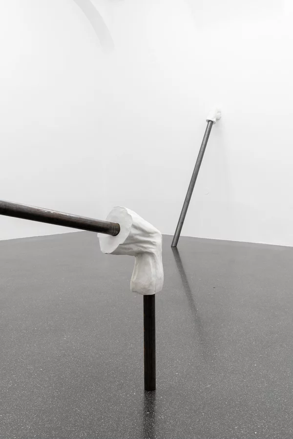 The artist connects tubes of black steel using knee molds made of papier-mâché. Reminiscent of ancient statues, this group of objects refers to an abstract, universal body. They move even further away from the human body. As objects, they are displayed in the exhibition space and are thus ultimately dehumanized. At the same time, the fragile sculptures refer to relics of buildings or monuments, whereby, in the face of destruction, the fragility of human life and social habitat appears equally in the fragments.