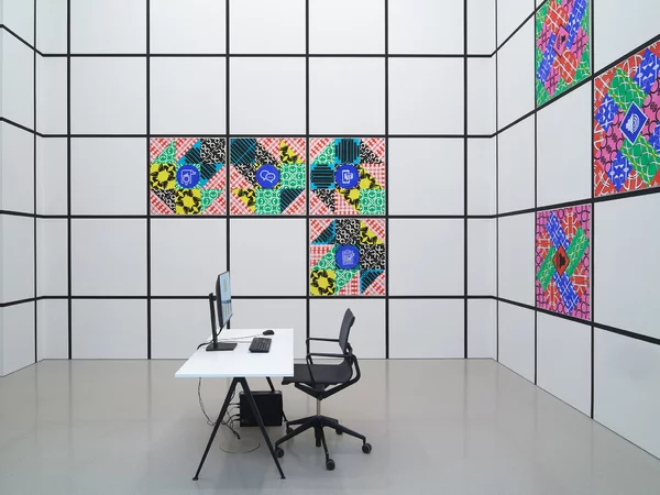 A closer look at these colorful, decorative paintings reveals familiar symbols of companies, currencies, states and organizations, including a WiFi sign, the Turkish lira, and the UN logo. Dossos made this work in response to the mysterious murder in Istanbul in October 2018 of the Saudi journalist Jamal Khashoggi, a victim whose killer has disappeared and whose body has never been found. The investigations that followed opened a unique door onto internet espionage, cyber weapons, state surveillance, and journalism. Each gouache is both an image in itself and a key to a specific media article that Dossos collected. After looking at the work, visitors are invited to follow the elaborate investigations on the central computer. Clicking on a pattern leads to an index that tracks the extensive implications of this terrible crime.