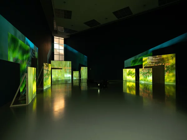 4-канальне відео, 2-канальний звук, сабвуфери, сталеві панелі, сублімаційні принти на шифоні, цифрові принти на папері